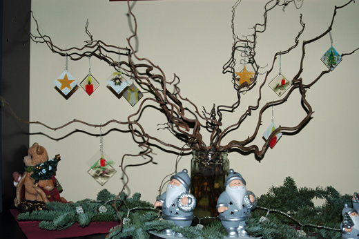Haselnussstrauch als Adventszweige und verzieren die Äste mit den Glasbilder aus der Weihnachtsserie.